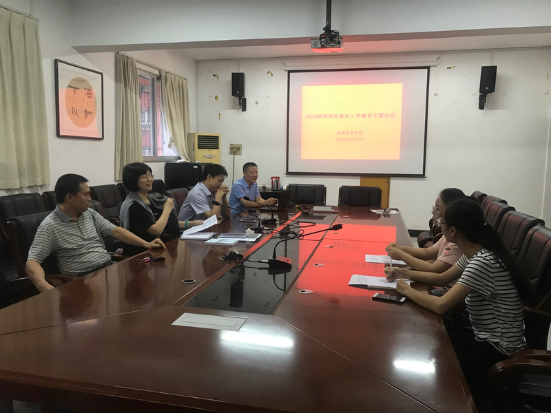 9月25日下午,旅游管理专业2018级研究生新生入学教育在一办公楼121会议室举行。院长何天祥教授、副院长麻学锋教授、院党委副书记郭一红副教授、校学术委员会委员刘长生教授出席会议,会议由郭一红副教授主持。